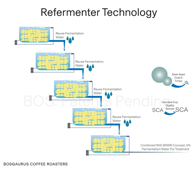 Công nghê sơ chế Refermenter (Tái men) là quy trình sơ chế cà phê tận dụng nước men từ bể lên men sơ chế ướt có sử dụng nấm men (với BOSGAURUS là Deep-washed) thay vì loại bỏ, áp dụng trên quy mô công nghiệp. Kỹ thuật này cho phép tái sử dụng nguồn vi sinh vật đã “sinh khối” để lên men nhiều mẻ cà phê liên tiếp (tối đa 5 lần), mà không làm suy giảm chất lượng cảm quan.