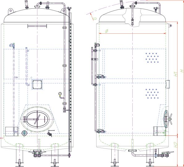 - Bia và rượu vang: môi trường là chất lỏng tự do. Nhiệt độ dễ dàng đối lưu tự nhiên giữa nóng và lạnh, hoặc thông qua khuấy chậm. Hệ số truyền nhiệt đối lưu (convection coefficient) cao 100–10.000 W/m²·K. Nhờ lớp cách nhiệt và hệ thống điều khiển nhiệt, nhiệt độ chất lỏng có thể được kiểm soát ±1°C trong toàn bồn.